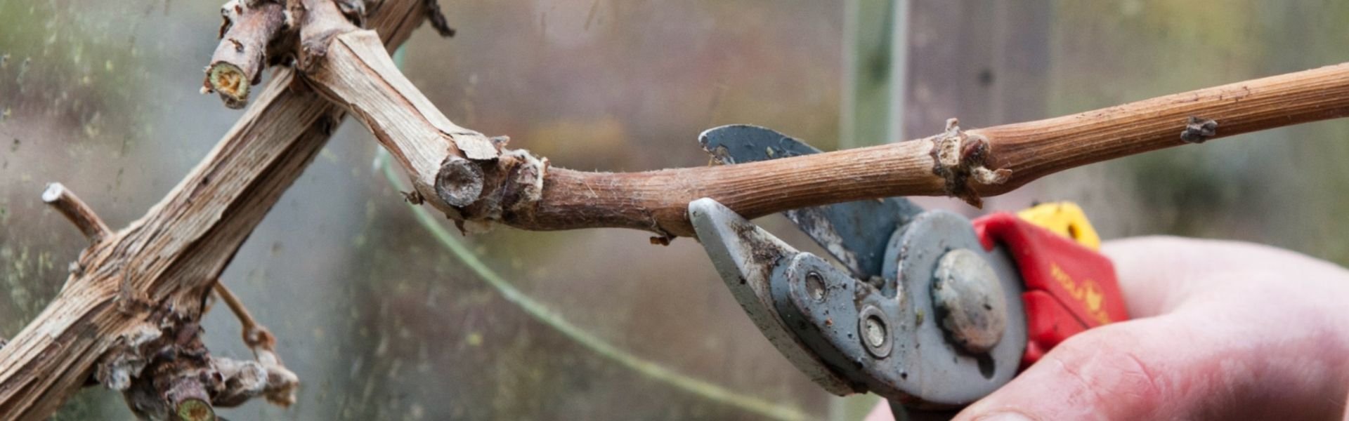 Har du lige plantet en helt ny vinranke i dit drivhus i år, så skal du først og fremmest vælge, om den skal have 1, 2, eller 3 hovedstammer. Når du har valgt de grene, som du vil bygge videre på, så skal du klippe skuddet eller skuddene tilbage til 50 cm. Er der allerede dannet sideskud, skal disse klippes tilbage til første synlige knop.