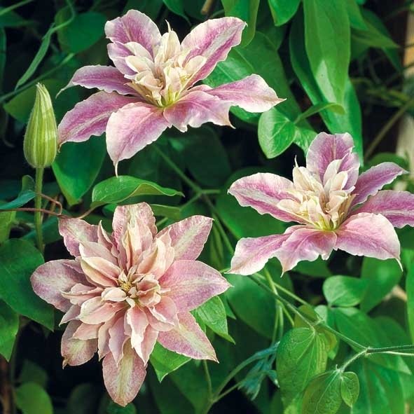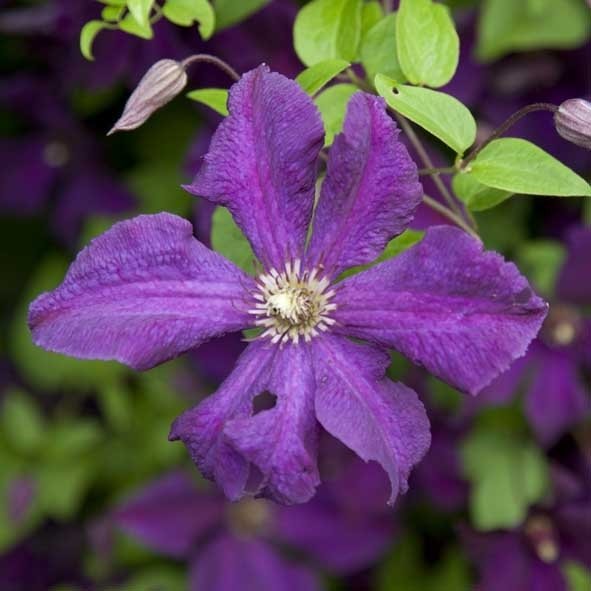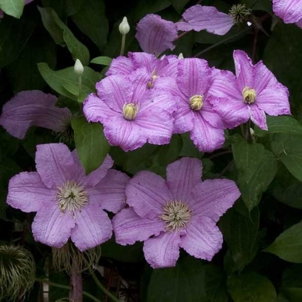 Skovranken får kaskader af halvfyldte lavendelblå blomster i maj-juni. Også velegnet op af mindre træer og prydbuske, da den er mere skyggetålende en de storblomstrede klematis.