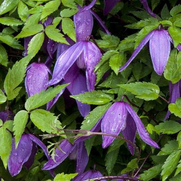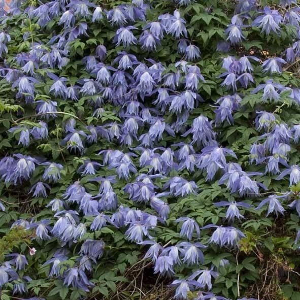 Alpeskovranke får et væld af blå klokkeformede blomster i maj-juni. Tåler mere skygge end andre klematissorter og er derfor velegnet til at vokse op ad mindre træer og prydbuske.