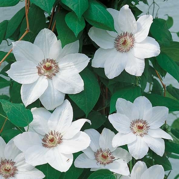 Storblomstret klematis med cremehvide blomster med rødbrune støvdragere i maj-juni og igen i september. Trives i sol-halvskygge. Beskæres efter første blomstring i juni.