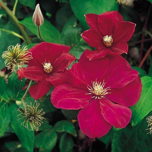 Klematis med store fløjelsagtige karmosinrøde blomster i juni og igen i september. Trives i sol-halvskygge. Beskæres i det tidlige forår – gerne ned til 10-20 cm.