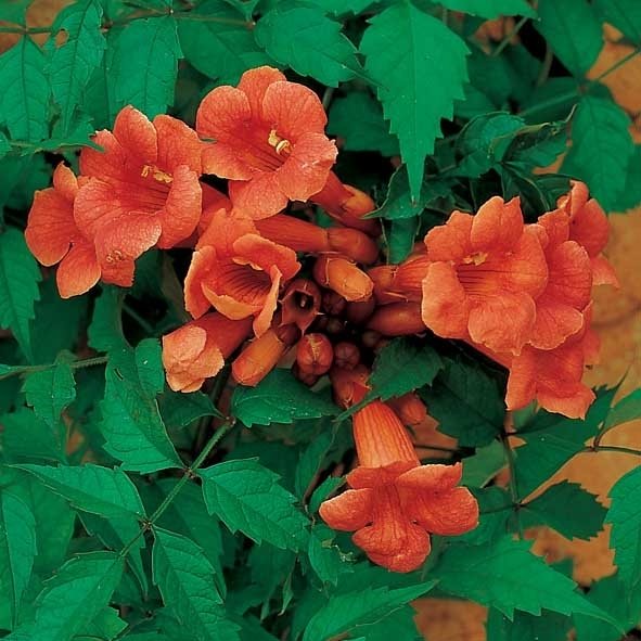 Kraftigtvoksende klatreplante med flot løv og i august-september trompetligende, orangerøde blomster. Trives på den solrige og lune plads – bedst op ad en mur mod syd eller vest.